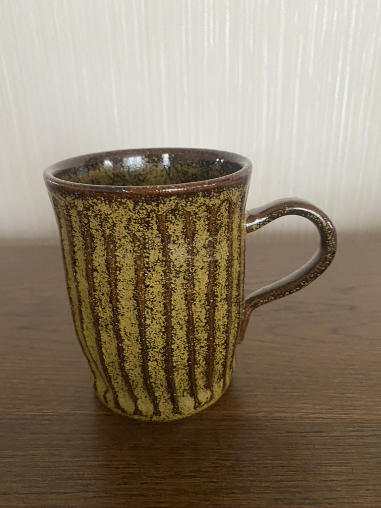 茶色に金がところどころ入っている大きめなマグカップになります。